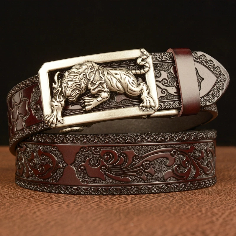Tigger Buckle with Tang Grass Pattern Leather Belt for Men Work of Art Belt Automatic Buckle Business Belt